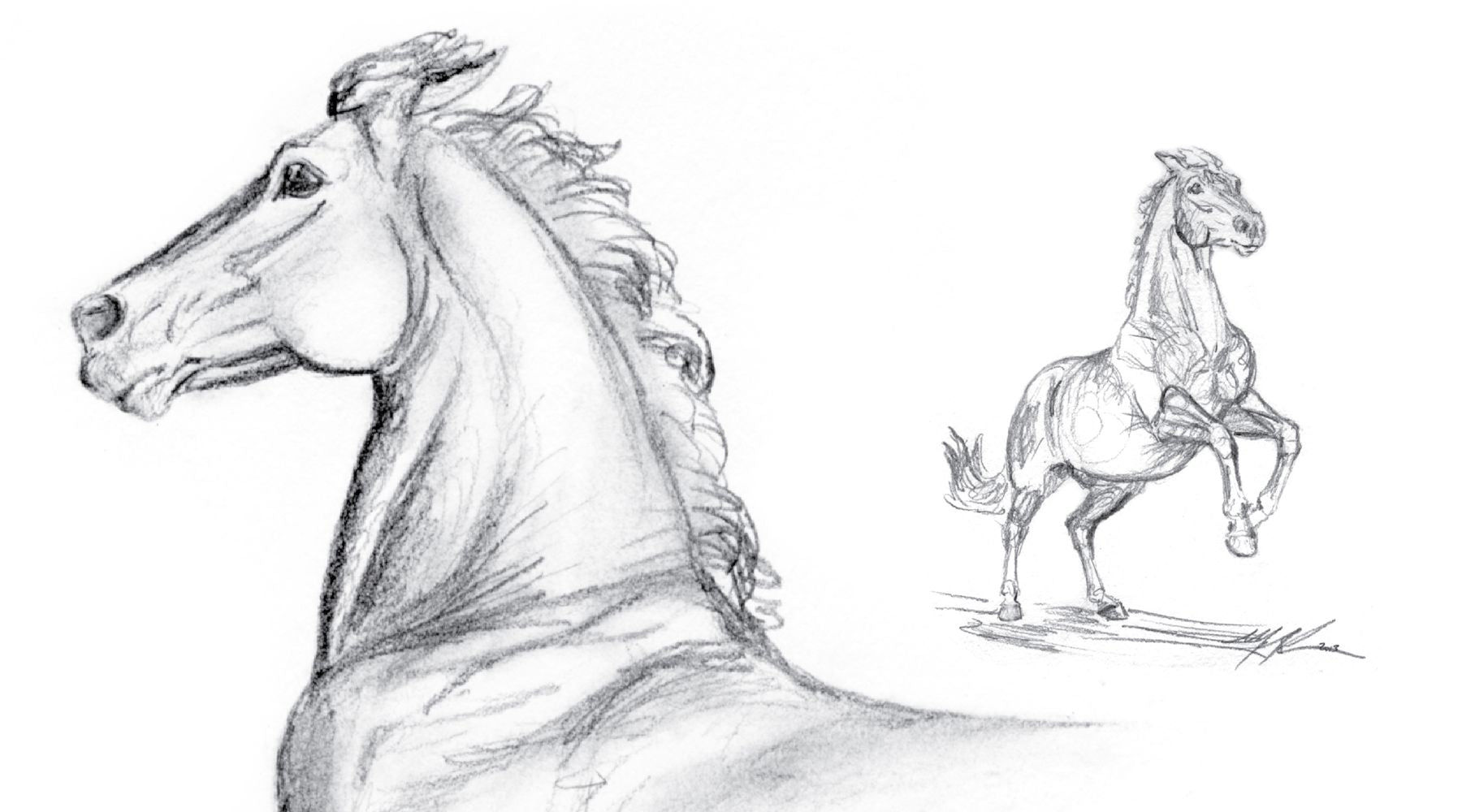 Photographic references are critical to her work. She finds that photographs show the shapes of the muscles as they are functioning more than anatomical books can. She says real life observations are also a must, but “not to despair about needing to witness exactly what you want to show.” Seeing the real thing gives a global picture of what’s really happening and how powerful horses are, but one of her favorite resources is watching and pausing videos. By doing that, she is able to study how particular muscles twitch and change shape, and find horses in the exact positions she wants to replicate.