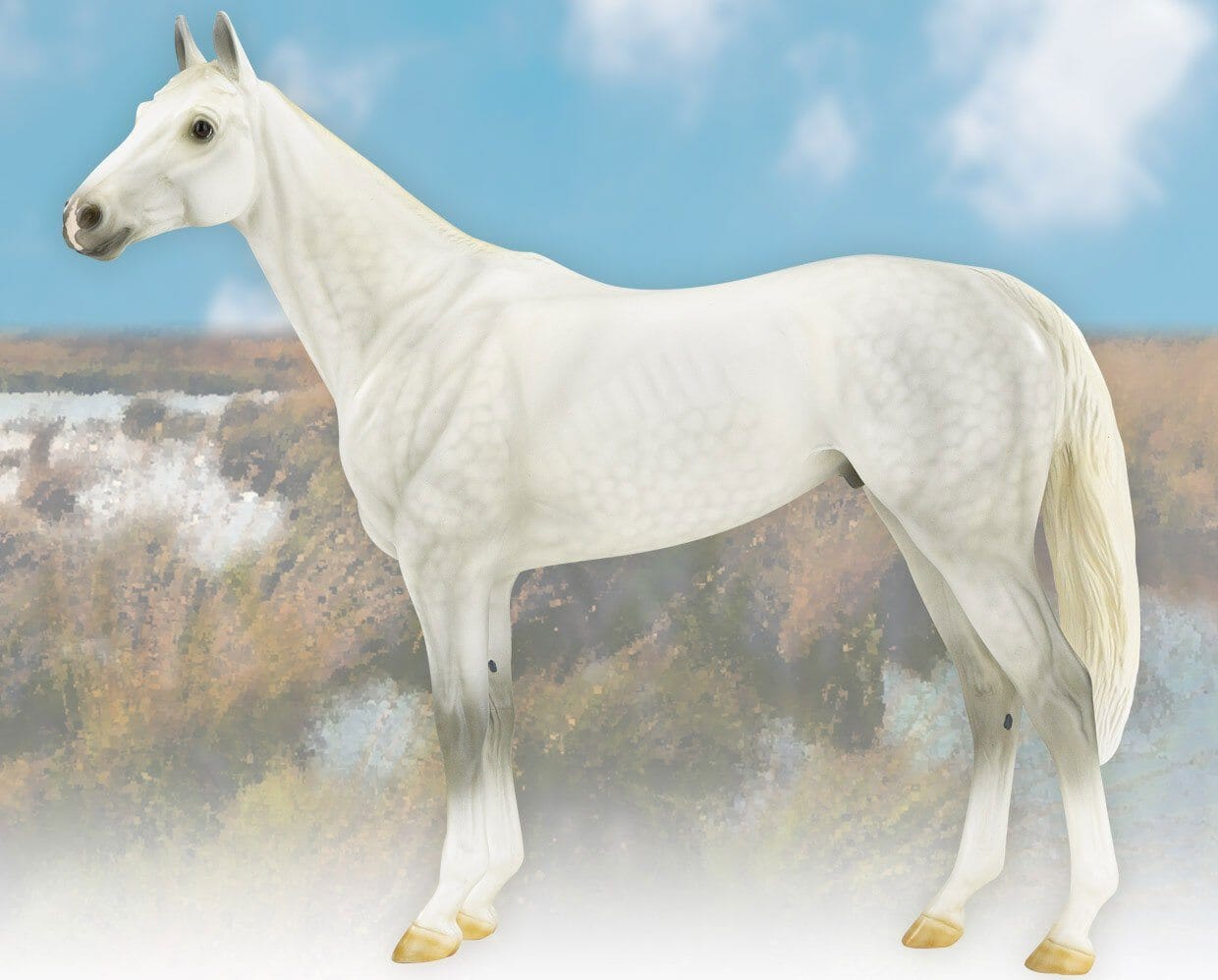 Elegant and watchful, “Crane” appears as serene as his feathered namesake. Designed by Sommer Prosser, this Thoroughbred’s softly shaded chalky coat features light dappling, and warm cream shading on his tail. His coloring and proudly arched neck gives him a distinctly crane-like air. His belly features “Crane 2021” in silver.