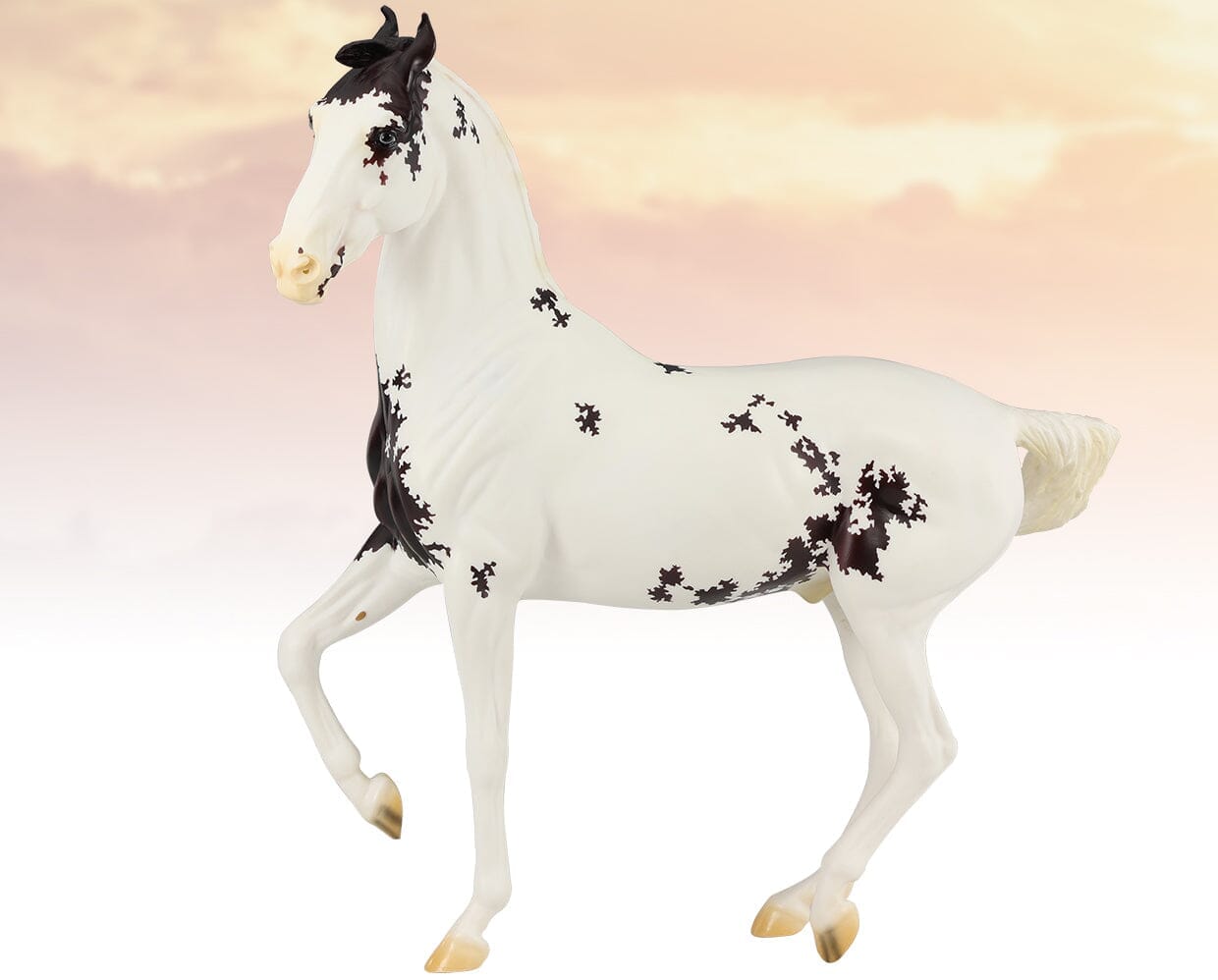 Breyer’s Exotic Destination series bring you Mumbai, a fine Marwari horse. Native to India, they are noted for their curved ears and outstanding endurance. Today the Marwari horse can often be found dressed in colorfully decorated blankets, ready to participate in celebrations. Colorful horses, including pintos, and flashy markings like large blazes and white socks, are prized within the breed.