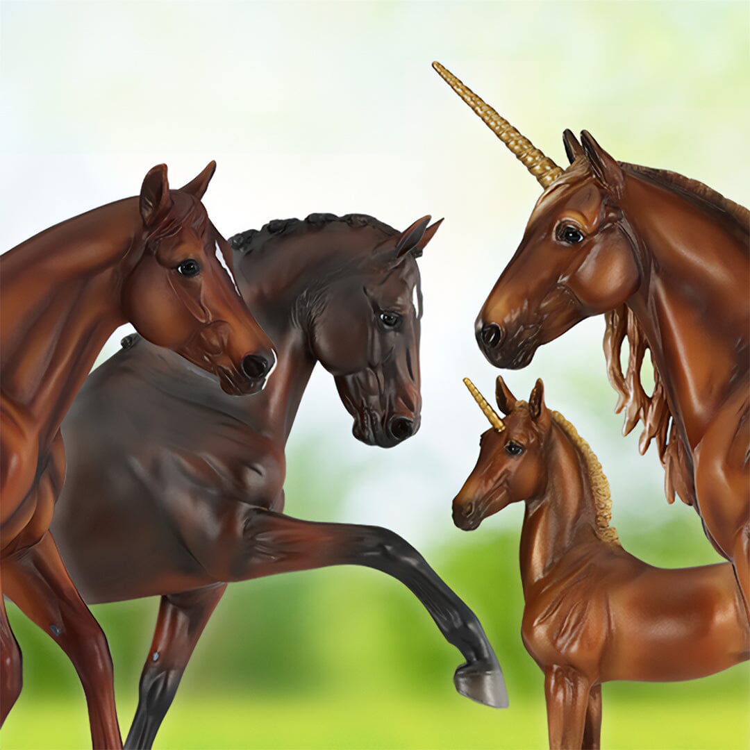 If you’re looking to add a little magic to your herd, Cyrus & Solana (#B-TR-10082) are a pair of golden chestnut unicorns that will be happy to lend their powers. Proud stallion Cyrus loves nothing more than patrolling his magical lands and watching over the unicorn herd. The newest and most precious member under his watch is his plucky filly, Solana. She keeps her father on his toes with her energetic foal antics, frolicking around the herd and exploring their territory. Cyrus shouldn’t be surprised – after all, she takes after him!