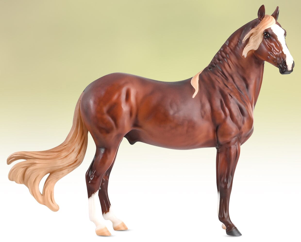 Canción’s name is, fittingly, Spanish for “song.” Jennifer Scott of Aspen Leaf Studios is the creative force behind this model’s creation. As a lifelong artist and horsewoman, she has always been inspired by the equine world. Jennifer created Canción as a picturesque Paso Fino stallion – his attentive gaze is accentuated by a large, cresty neck and a billowing mane and tail. She also designed his bright chestnut coat, which brings out every tiny detail of this stunning sculpture. This version features a classic matte finish.