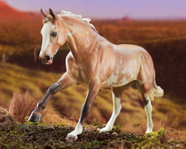 Dundee is a flashy Australian Stock Horse gelding. Dundee's show-stopping coat was created by artist Nikki Button. While this is Nikki's first piece with Breyer, she's well-known in the model horse community for her attention to detail and soft shading. Nikki's talent with pigments and soft pastels allowed her to create Dundee's realistic dunalino overo pinto coat. His coat has mapped markings, detailed eyes, striped hooves, ermine spots, and Australian Stock Horse brands on both shoulders! The BH is his "Stock Brand" (for Breyer Horses) and 2 over 8 is his identification number (2 for being the second release in the 2018 Premier Collection, and 8 for his "birth" year).