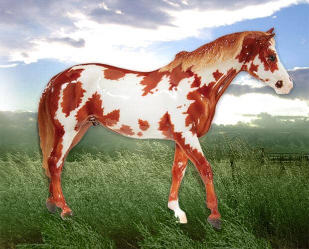 Introducing Roman! The Third Release in the 2018 Vintage Club. Chris Hess' San Domingo (mold #67) arrived in stores in 1978, joining a long list of Breyer models - from Misty in 1972, through Brown Sunshine in 1996 - inspired by the books of Marguerite Henry. A longtime collector favorite, San Domingo looks handsome in any color, but we feel he has always looked his best in spotted colors that hearken back to his wild Mustang heritage. In a Flaxen Chestnut Frame Overo pattern combining the Gloss finish of the past with the modern masking techniques of the present, we think Roman looks smashing in his Vintage Club debut!