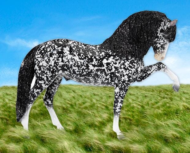 Andalusians, especially those of Legionario's rare Cartujano bloodlines, are predominately gray, so it is fitting that Ulysses comes in Glossy Dapple Black. A color variation once unique to the #93 Dapple Gray Belgian, it is considered one of the most beautiful and desirable of Breyer's many shades of gray. I think we can all agree, he wears it well!