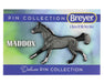 The deluxe enamel pin is approximately 2" wide and features 2 posts with butterfly backs for extra durability and to prevent spinning. It is stamped with the Breyer logo on the back and comes on a personalized backer card.