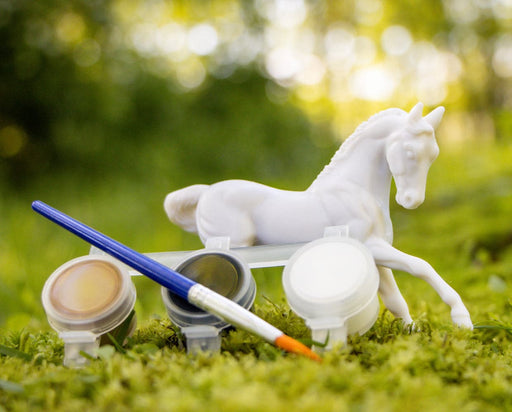 Painting is a beloved activity by Breyer fans of all ages, and now there’s a unicorn they’ll want to add to their herd! This fun kit includes everything needed to paint a colorful unicorn: 1 unpainted unicorn, 1 paintbrush, 6 paint pots, and 1 hairbrush. The brushable mane and tail makes it a toy and a craft - all in one!