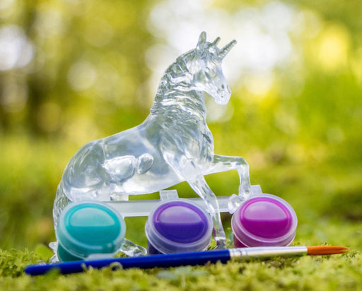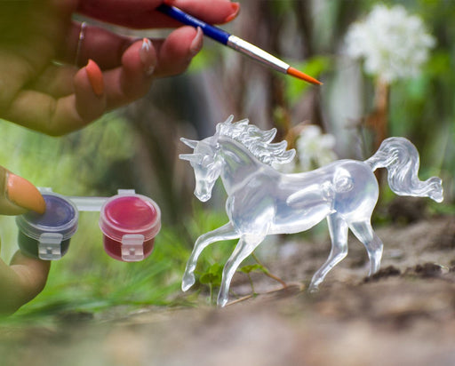 Everyone's favorite Stablemates craft is now available with unicorns! With four different unicorn models, everyone can paint their favorite. These models come on a blister card, and are complete with three paint pots of iridescent colors (silver, pink, and purple), as well as a paintbrush.