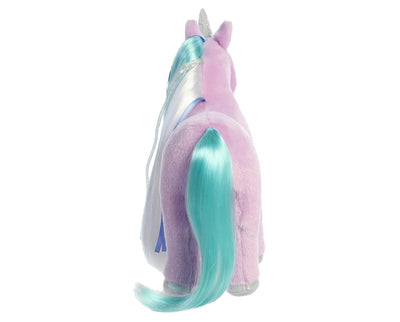 Meet Twilight - a sweet Mane Event Unicorn! This cute unicorn is an orchid purple color whose mane and tale are bright teal and white. It has a sparkly silver horn and hooves and the mane is decorated with indigo and sparkly silver ribbons.